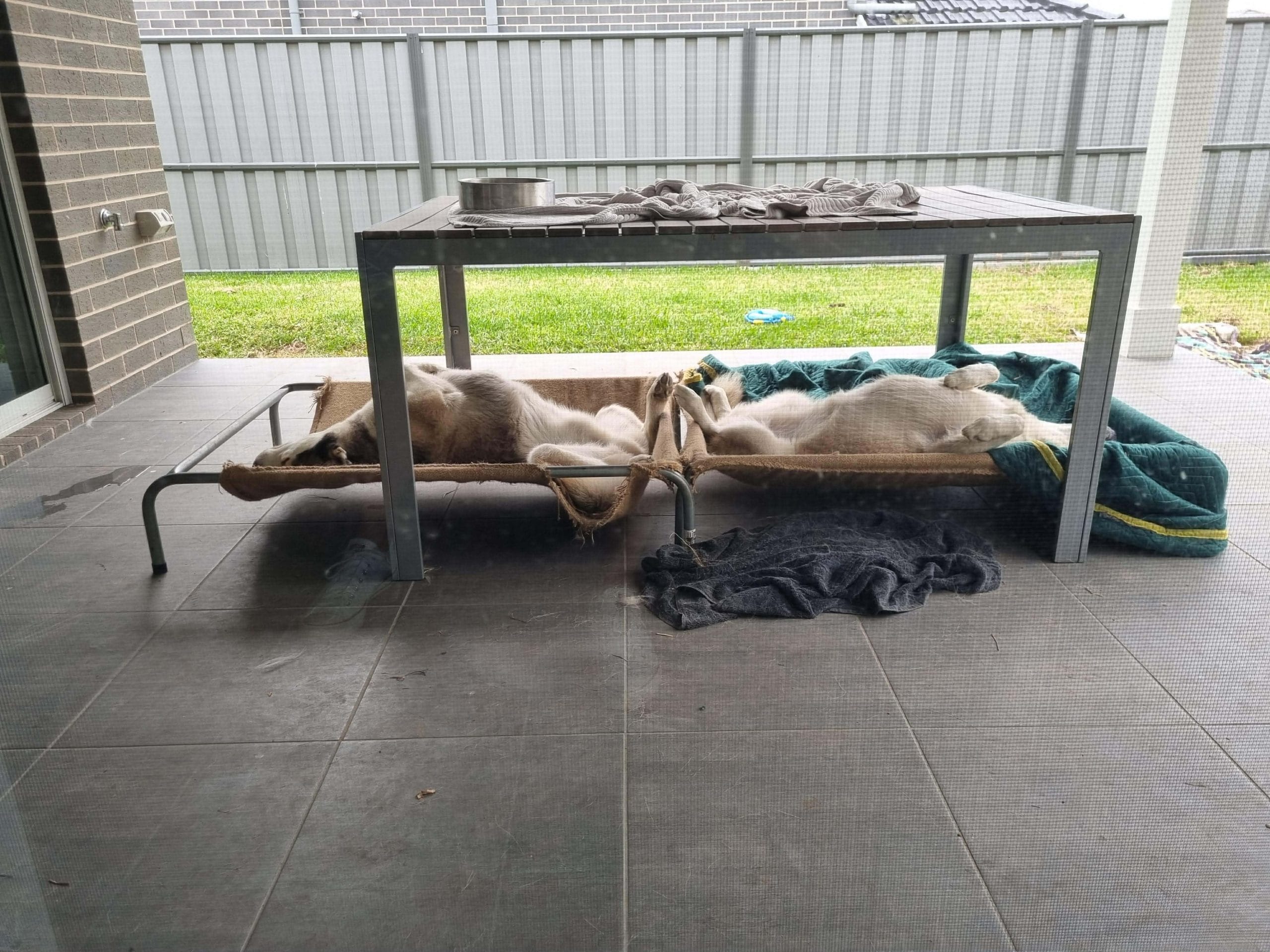 They know many commands including sit, down, stay, shake, spin and roll over. They enjoy being inside with the family when someone is home and relax outside when everyone is out. They have no issues during storms and only speak or cry to remind you when it is time for dinner.