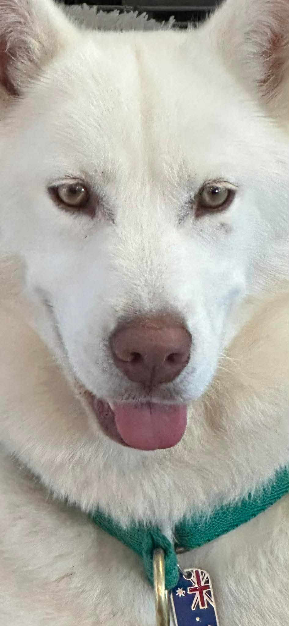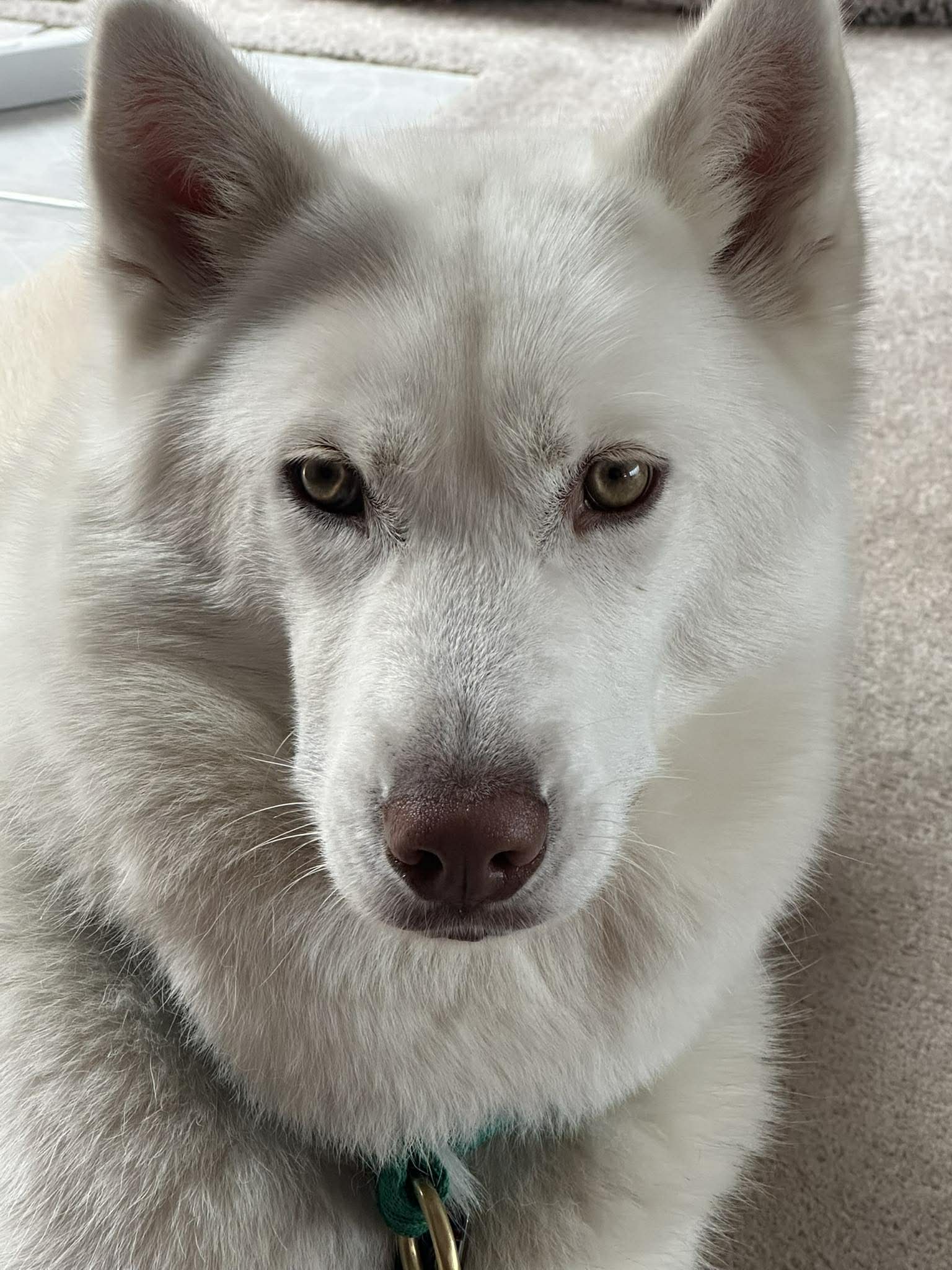 Introducing this vision of loveliness, Sadie, a stunning white husky with exquisite translucent hazel eyes.